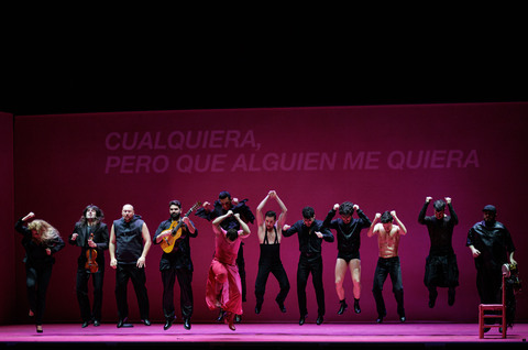 "Cualquiera, pero que alguien me quiera" : cette proclamation projetée en fond de scène conclut les quelques deux heures d’un des plus enthousiasmants spectacles flamencos que nous ayons vus et entendus ces dernières années. Sur ce point, Manuel Liñán et ses partenaires n’ont pas de souci à se faire. Tous les spectateurs de la salle archi-comble du Teatro Villamarta les aiment, comme l’attestait l’ovation qui les salua avant même qu’ils n’apparaissent sur scène. Nous avions déjà admiré "Muerta de amor" en juillet dernier lors du Festival Arte Flamenco de Mont-de-Marsan et avions pensé y découvrir l’acte de naissance du Musical Flamenco (nos lectrices et lecteurs attentifs voudront bien nous pardonner de reprendre en partie ce que nous avions écrit à l’époque). L’œuvre manquait alors cependant un peu de rythme pour être tout à fait comparable aux chefs d’œuvre de Broadway. Augmentée de près d’une demi-heure, la version à laquelle nous avons assisté hier nous a cependant paru plus courte, tant les transitions, notamment entre les performances musicales des danseurs-chanteurs et celles des musiciens proprement dits, ont été améliorées.