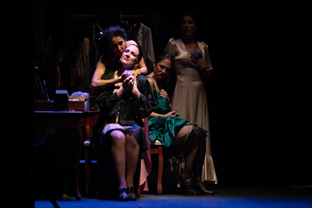 "El penúltimo cuplé" nous invite dans les loges d’un théâtre ou d’un cabaret, lieu d’une rencontre au sommet entre cinq stars du genre qui présentent un spectacle en forme de hit-parade de leurs principaux succès : La Chelito (Luisa Palicio), La Fornarina (Coral Moreno), Raquel Meller (Ana Oropesa), Amalia Molina (Inma "la Carbonera") et La Cachavera (Ángeles Rusó). Malgré l’exigüité du plateau de la Sala Compañía, les lumières d’Antonio Valiente parviennent à découper l’espace en deux plans distincts : éclairage tamisé à l’arrière pour les loges, spots à l’avant pour la scène du cabaret où a lieu la représentation. Les artistes vont et viennent entre les deux, selon qu’elles échangent des souvenirs de leur carrière ou qu’elles les chantent et les dansent pour notre plus grand plaisir. C’est surtout le porte-manteau et sa garde-robe multicolore qui font office de point de ralliement, avec bien sûr un miroir et une coiffeuse. Donc, incessants changements de costumes (Luisa Palicio et José María Tarriño), bijoux clinquants, échanges de chapeaux exubérants et de châles précieux, etc. : on sait que les cupletistas ne lésinaient pas quant à leurs tenues de scènes, par lesquelles elles attiraient le public et faisaient parade de leur réussite financière, et qu’elles n’hésitaient pas à les commander aux plus grands stylistes parisiens. De ce point de vue, chaque tableau est une réussite visuelle incontestable, comme il convient pour une revue de "variétés".