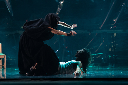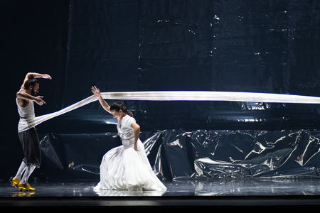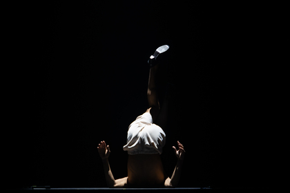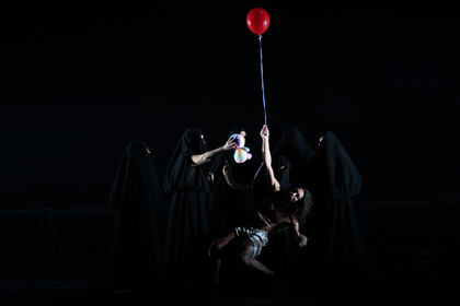 Avec "(La intemperie", nous faisons longuement connaissance avec deux des principaux protagonistes de "El manto y su ojo", au demeurant aussi magnifiques qu’originaux : les lumières (Rafael Gómez) et le découpage vertical de l’espace scénique en plusieurs plans superposés. Seul en scène, Eduardo Guerrero semble vouloir s’extraire du sommeil, ou échapper à un rêve obsédant. Entre mime, expression corporelle et danse contemporaine, nous le voyons tenter de se lever et échouer à plusieurs reprises, puis se redresser enfin, jambes flageolantes. Entre violent éblouissement et totale obscurité, des flashs subliminaux font fugacement apparaître le guitariste (Pino Losada) puis le chœur des dames en noir — rêves prémonitoires ? Ces dernières finissent par s’imposer, guidant ou tourmentant, on ne sait, un Eduardo Guerrero vêtu d’une sorte de pagne blanc. Sur une chorégraphie très réussie bien que fort peu "flamenca", cette première scène s’achève sur de belles images de groupe christiques, dont une pietà. L’irruption d’un smartphone utilisé pour un selfie, puis celle d’un ballon en baudruche rouge qui s’envole nonchalamment, viennent cependant désamorcer ce qui aurait pu apparaître comme un préambule mystique. Le spectacle juxtapose ou superpose ainsi constamment images oniriques et détails platement prosaïques, coq-à-l’âne en équilibre instable sur la limite incertaine entre rêve et réalité.