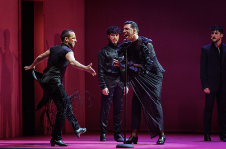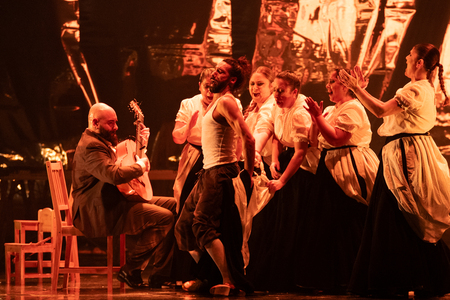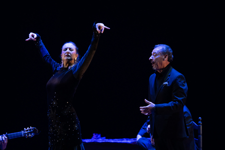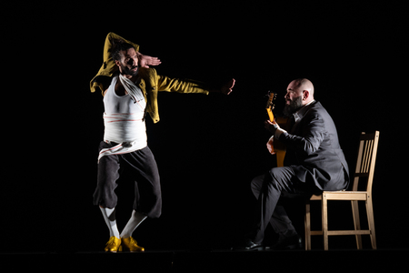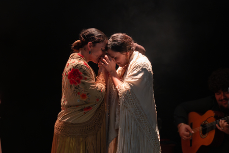 Les premiers tableaux résument le propos et en annoncent les épisodes contrastés. Mara Rey incarne la copla, qui resta pendant des décennies la bande sonore rituelle de toutes les histoires d’amour du cinéma espagnol — la copla en tant que genre, et non une "coplera", puisque la bande sonore du spectacle puise entre autres dans les répertoires de Marifé de Triana, Rocío Jurado et María Jiménez, par ordre d’outrance expressionniste croissante. Elle pousse d’ailleurs la démesure vocale et gestuelle de ces interprètes jusqu’à l’extrême caricature encore soulignée par une robe et une mantille, directement inspirées des portraits symbolistes de Julio Romero de Torres. Immobiles, les danseurs lui répondent par des refrains chantés en chœur a cappella, ponctués de bruits de respirations / expirations — l’une des trames sonores du spectacle sera dès lors le souffle des corps qui, varié selon les émotions de telle ou telle scène, incarne le tempo et le compás appropriés. Manuel Liñan s’empare alors du micro de la chanteuse et esquisse une chorégraphie avec son fil et son pied. Les micros vagabonds, singulièrement celui de Liñan, seront les seuls accessoires du spectacle, dont nous vous laissons imaginer les divers symbolismes déclinés au fil des tableaux. L’entrée des instruments, guitare (Fran Vinuesa), violon (Víctor Guadiana) et percussions (Javier Teruel) accompagne une première soleá, suivie d’un cuplé por bulería chanté et dansé en duo avec Manuel Liñán par Miguel Ángel Heredia.