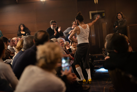 ...qui finalement survient. Le rideau tombe et Eduardo Guerrero est isolé en bord de scène, monologuant d’abord tout en cherchant vainement la sortie, puis s’adressant directement au public. Fin ? C’est en tout cas ce que croient les spectateurs, qui applaudissent et enchaînent par une ovation debout, comme c’est devenu rituel pour tout spectacle de flamenco qui se respecte. Mais... on sent comme un doute. Le danseur persiste à monologuer, commence à déambuler dans les travées et rencontre miraculeusement un aficionado anonyme — en fait Luis de Perikin, par ailleurs co-compositeur de la musique du spectacle. Sur l’air du "¡ Olé con olé y olé !", le jingle du festival créé par Diego Carrasco, la performance plus ou moins improvisée (plutôt moins sans doute) s’achève par quelques "pataítas" por bulería avant un retour sur scène qui marque le début d’une deuxième partie un peu plus classiquement flamenca, mais pas la fin des cauchemars.