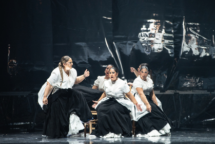 Commençons prudemment par décrypter le titre du spectacle, "El manto y su ojo". Il s’agit d’une longue et informe chasuble noire à capuchon masquant entièrement le visage, à l’exception de l’œil gauche. Remontant au XVIe ou au XVIIe siècle, cette tenue demeura longtemps le costume traditionnel des "cobijadas" de Vejer de la Frontera — des femmes dont il protégeait la "vertu" ou l’anonymat, on ne sait. Ce sont elles en tout cas qui peuplent, hantent, surveillent, etc. les nuits et les insomnies cauchemardesques d’Eduardo Guerrero. Elles aussi qui en assurent impeccablement les parties vocales, chants folkloriques ou cantes, en soliste ou en chœurs polyphoniques : Anabel Rivera, Felipa del Moreno, Julia Acosta, Pilar Sierra, Rosario Heredia et Samara Montañez. Les premiers tableaux sont d’ailleurs de structure vocale symétrique : chœur / soliste / chœur.
