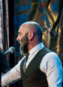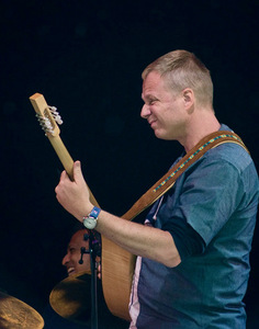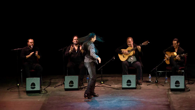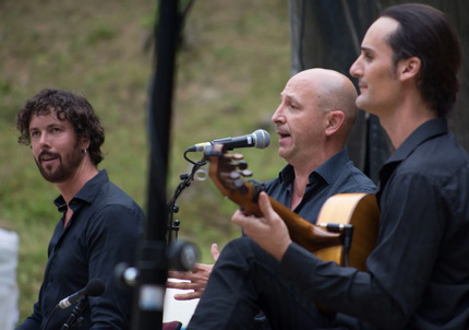 La plupart des pièces étaient basées sur les compases de tango-rumba et de bulería, réduite à un medio compás ternaire qui pouvait aussi bien faire office de 4/4 jazzy propice aux chorus du leader. Il n’en résultait cependant aucune monotonie, tant le groupe sait tirer partie de toutes les textures rythmiques, mélodiques et sonores offertes par les diverses configurations des cordes pincées, des percussions et des voix. Nous en avons eu une première démonstration avec les deux volets de "Podemos" qui ouvraient le concert : introduction de guitare en claire référence au style de Paco de Lucía (alternance entre passages ad lib. et ébauches de bulería façon "Huida" et mode flamenco sur Do# avec cadences rappelant la rondeña" Mi niño Curro"), suivie d’une canción por bulería ponctuée d’ "ayeos" à deux voix et de breaks de saz et de guitare.